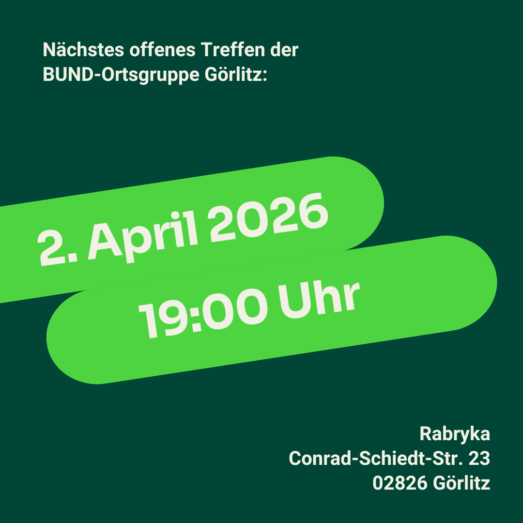 Alle Interessierten, ob Mitglieder*innen des BUNDs oder nicht, sind herzlich eingeladen zu unseren offenen Ortsgruppentreffen am jeweils ersten Donnerstag im Monat ab 19 Uhr. Hier wird der Fortschritt laufender Projekte, Veranstaltungen oder Arbeitseinsätze geplant, neue Ideen für Projekte gesammelt, aktuelle Dinge zum Thema Naturschutz in Görlitz oder laufende Anfragen besprochen, sowie Hinweise und Fragen entgegengenommen.